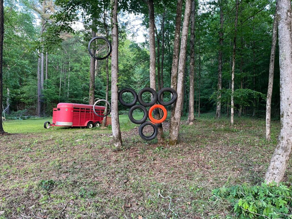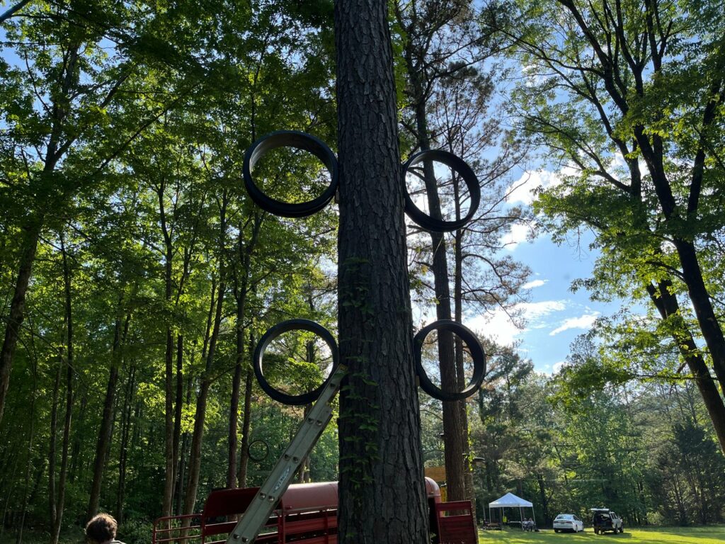 The tire-angle was a heavy pain in the back, lol. But it’s super cool. A new community member donated the tires and was one of the main ones helping. He got the idea to paint the one tire orange to basiclly warn you of death by tree on the other side, haha.