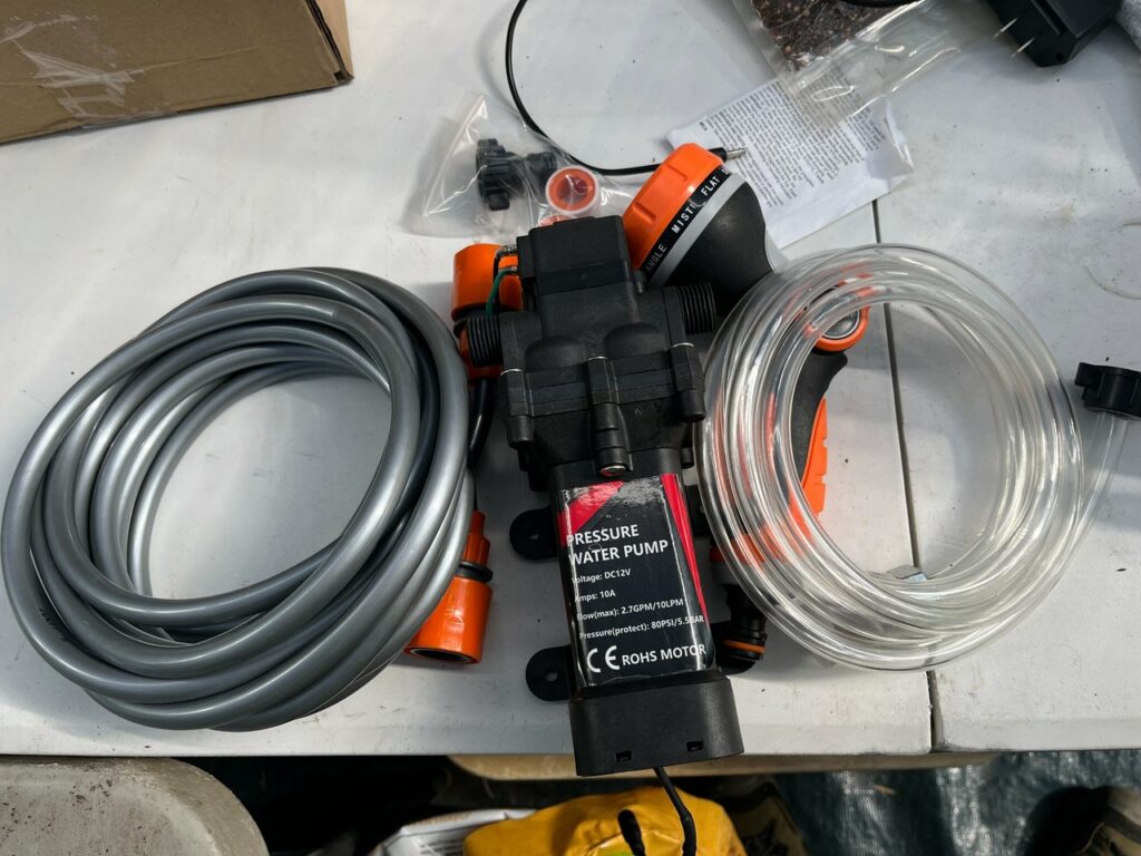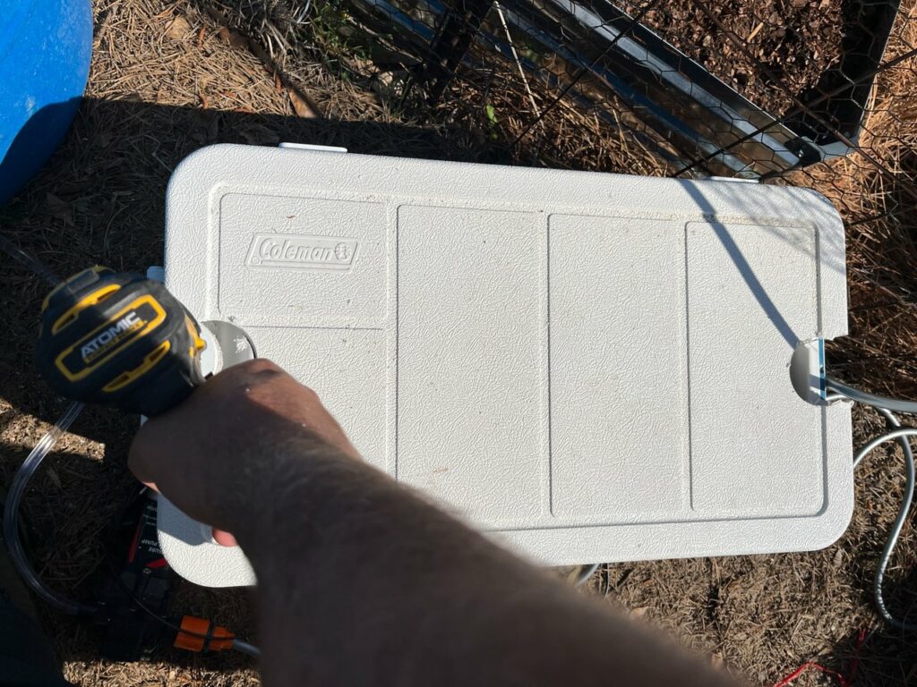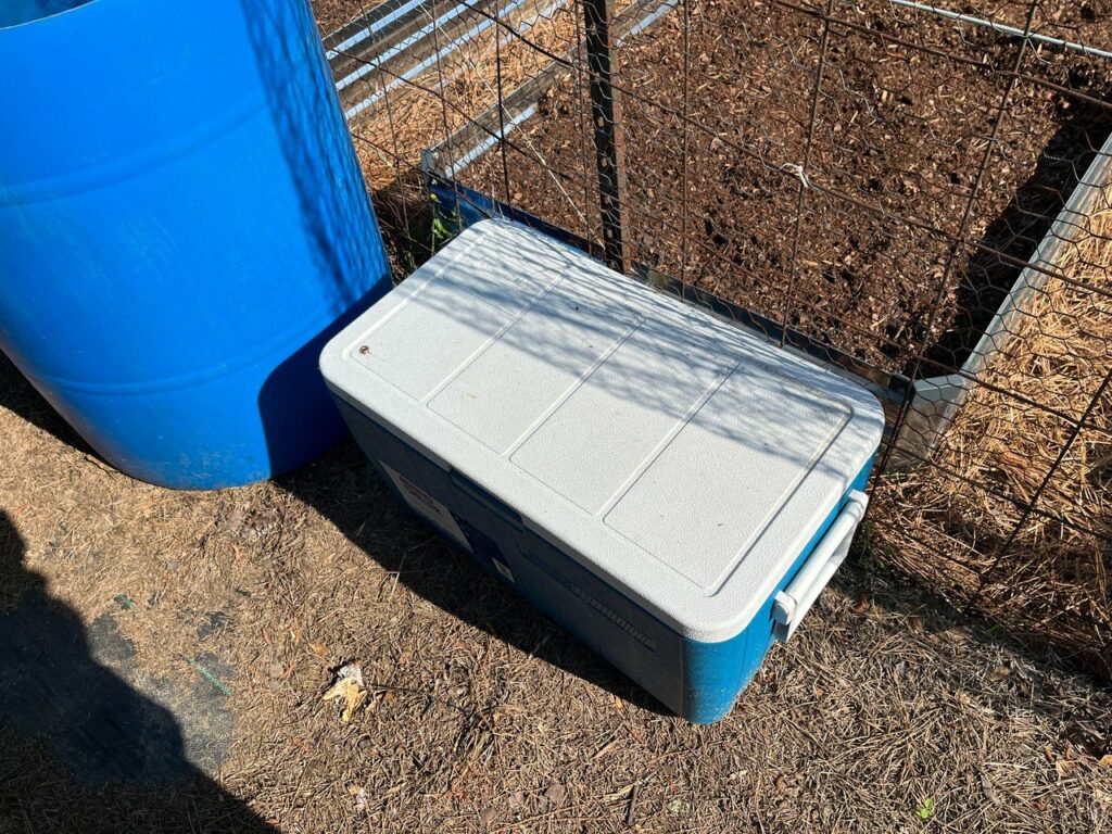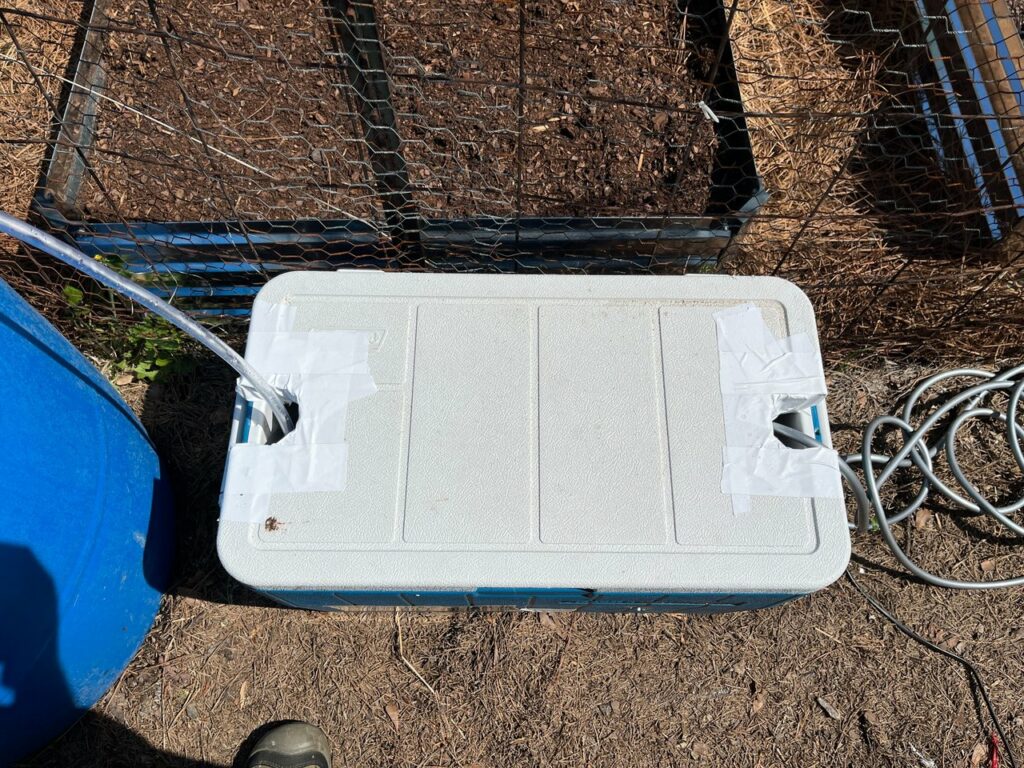I got the barrels cleaned out and dragged the hose over to fill them up so I didn’t have to wait on rain to do the job for me. I also had a cooler that was laying around not being used, so I figured it would make the perfect housing for the pump and hoses that I bought for this setup.