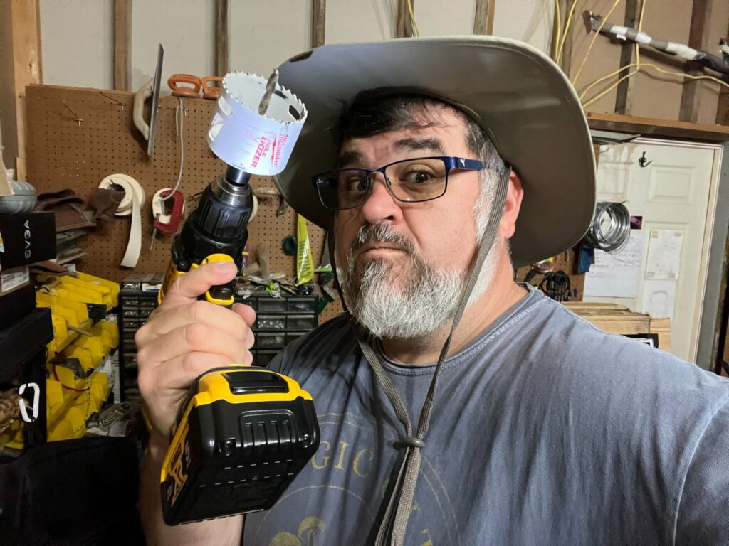Once I had it connected, I took it outside to see how it was going to all work and go together. I figured out where I needed to cut some holes in the lid to give access for the hoses and make it where I could pull them and then store them. So I went and got the big drill bit and went to work!