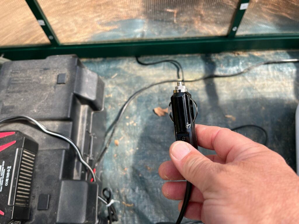 This way, when I need to plug in the pump to water the gardens, then I can just go into the greenhouse and connect the 12V cigarette adaptor into my solar powered battery system and power up the pump.