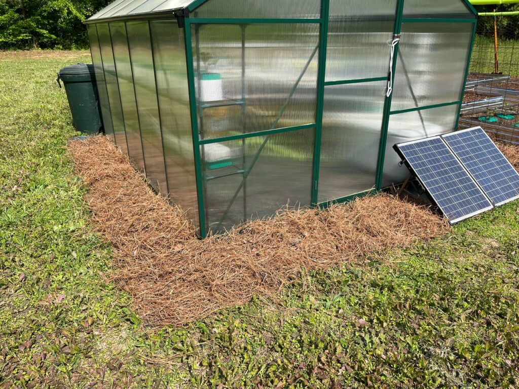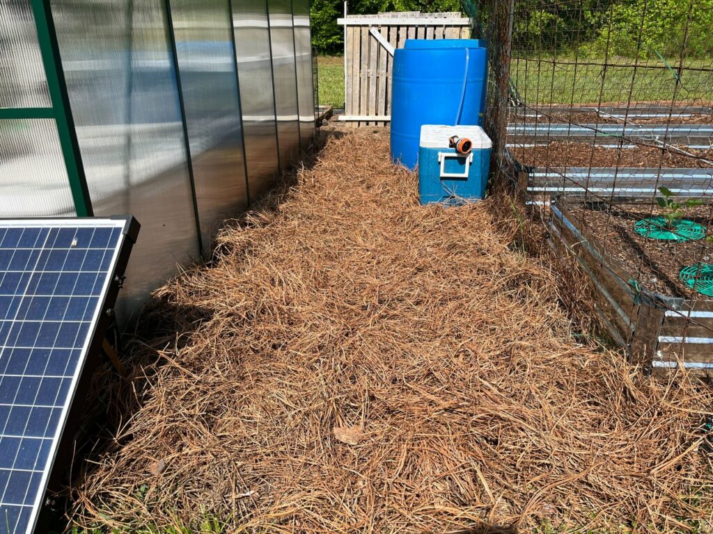 Now that is all finished, I finished spreading out the bails of pine straw I had to use as mulch for the area to make it look nice. I went ahead and finished all around the greenhouse as well, which was another little job I needed to handle.